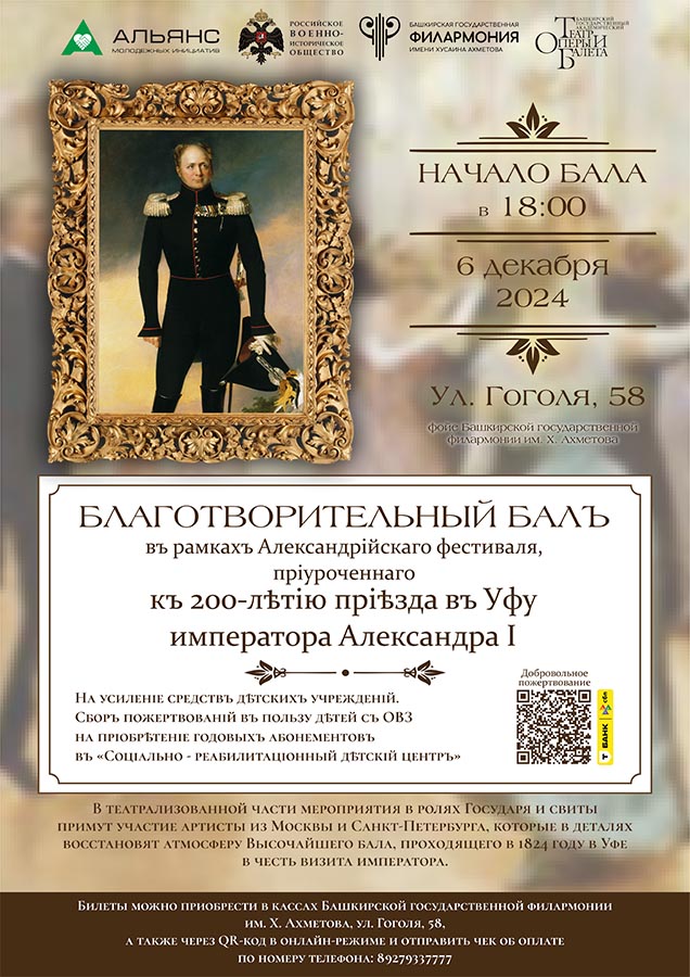 Дорогие друзья! 6 декабря 2024 года в 18:00, в историческом центре города Уфы, состоится Благотворительный Бал, приуроченный к 200-летию приезда в Уфу императора Александра I Благословенного, который соберет гостей в фойе большого зала Башкирской государственной филармонии им. Х. Ахметова. Данное событие проходит в столице Башкортостана впервые за 200 лет. В театрализованной части мероприятия в ролях Государя и свиты примут участие артисты из Санкт Петербурга и Москвы, которые в деталях восстановят атмосферу Высочайшего бала, проходившего в Уфе в честь визита императора в 1824г., они переместят нас в ту эпоху, победного, над Наполеоном времени, великих реформ императора Александра Благословенного- золотого времени роста и процветания нашей Великой России! Сегодня это первое, такого рода, значимое событие в общественной жизни нашей Республики. Бал пройдет при поддержке Регионального отделения РВИО в Республике Башкортостан, Башкирской государственной филармонии им. Х. Ахметова, Башкирского государственного академического театра оперы и балета и Министерства Культуры РБ. Гости и участники события: политики и почетные горожане Республики Башкортостан, деятели науки и медицины, историки и краеведы, владельцы финансовых и инвестиционных компаний, предприниматели, благотворители, меценаты и небезразличные люди, желающие помочь особенным детям. Тема организаторами, была выбрана не случайно, историческая традиция проведения балов вызывает большой интерес у наших современников. Гости смогут стать непосредственными участниками бала. Реконструкторы воссоздадут эпоху правления Александра I и переместят нас в атмосферу бала, на котором будет играть музыка, воспроизведется серия танцев и игр. Гости познают быт эпохи XIX века, обретут новые знакомства, смогут продемонстрировать свое танцевальное мастерство и прикоснутся к нравственным и духовным ценностям той великой эпохи. Собранные средства будут направлены на приобретение годовых абонементов, в Социально-реабилитационный центр для детей с ОВЗ.